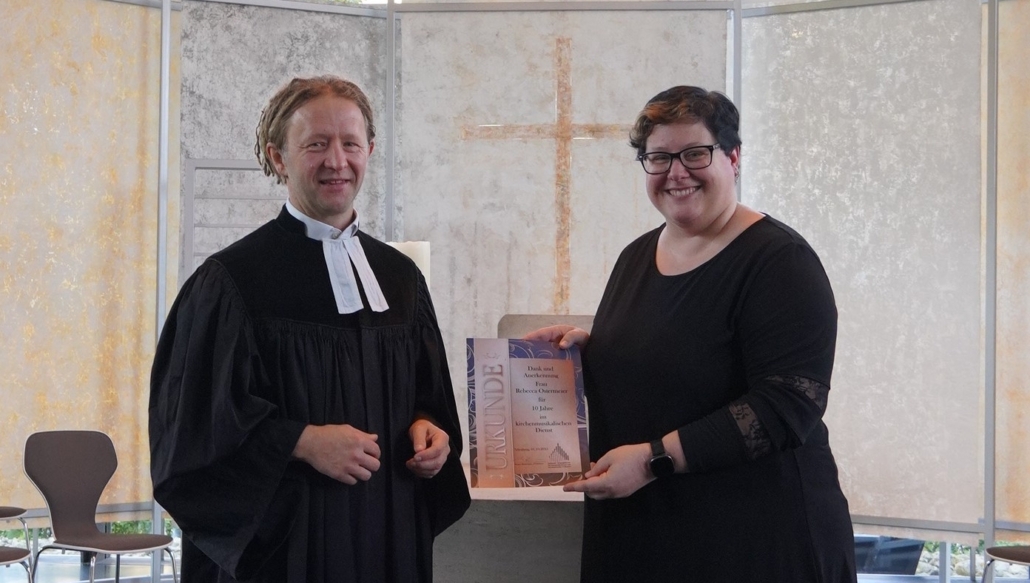 Im Erntedankgottesdienst wurde Organistin Rebecca Ostermeier von Pfarrer Bernd Schindler eine Urkunde des Verbandes Evangelischer Kirchenmusikerinnen und Kirchenmusiker in Bayern für 10 Jahre kirchenmusikalischen Dienst überreicht.