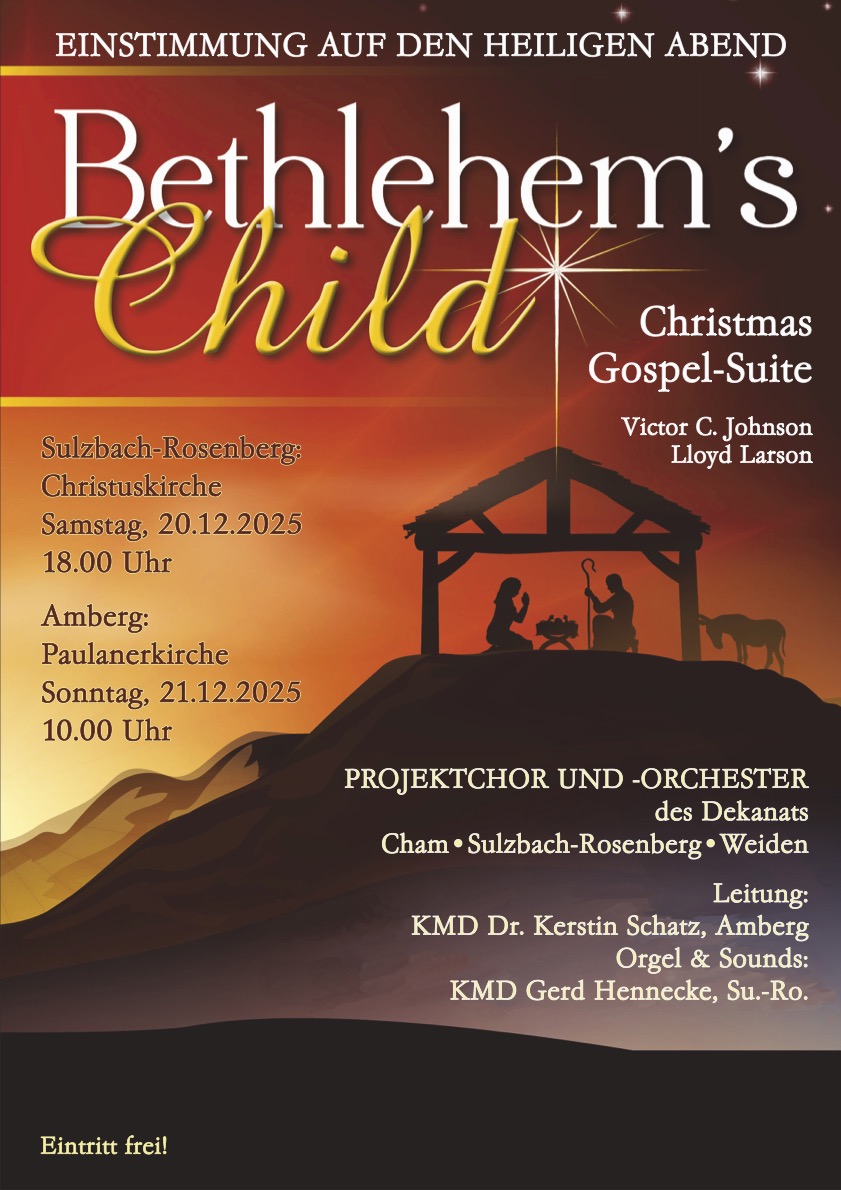 Am Sonntag, den 21. Dezember feiern wir um 10.00 Uhr in der Paulanerkirche einen besonderen Gottesdienst zum 4. Advent und zur Einstimmung auf Weihnachten (Liturgin: Dekanin Ulrike Dittmar). Es erklingt „Bethlehem´s Child“, ein modernes, schwungvolles Werk für Gospelchor und Orchester von Lloyd Larson und Victor Johnson.